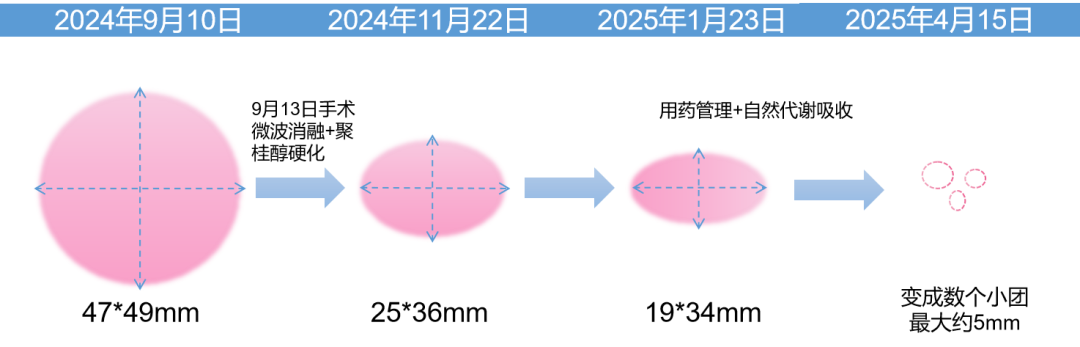 手术过程中,汤长江主任在阿霞的右下腹部穿刺2毫米小口,将微波消融针穿入病灶,发射微波进行消融,总历时7分20秒。随后,通过穿刺针将5毫升聚桂醇注射液注入病灶区域,巩固治疗结果。阿霞在术前术后总共住院5天,变完成了治疗。出院后,痛经的情况明显改善,邓伟芬主任为阿霞安排了巩固治疗的药物,并叮嘱她按时回院复查病灶的吸收情况。