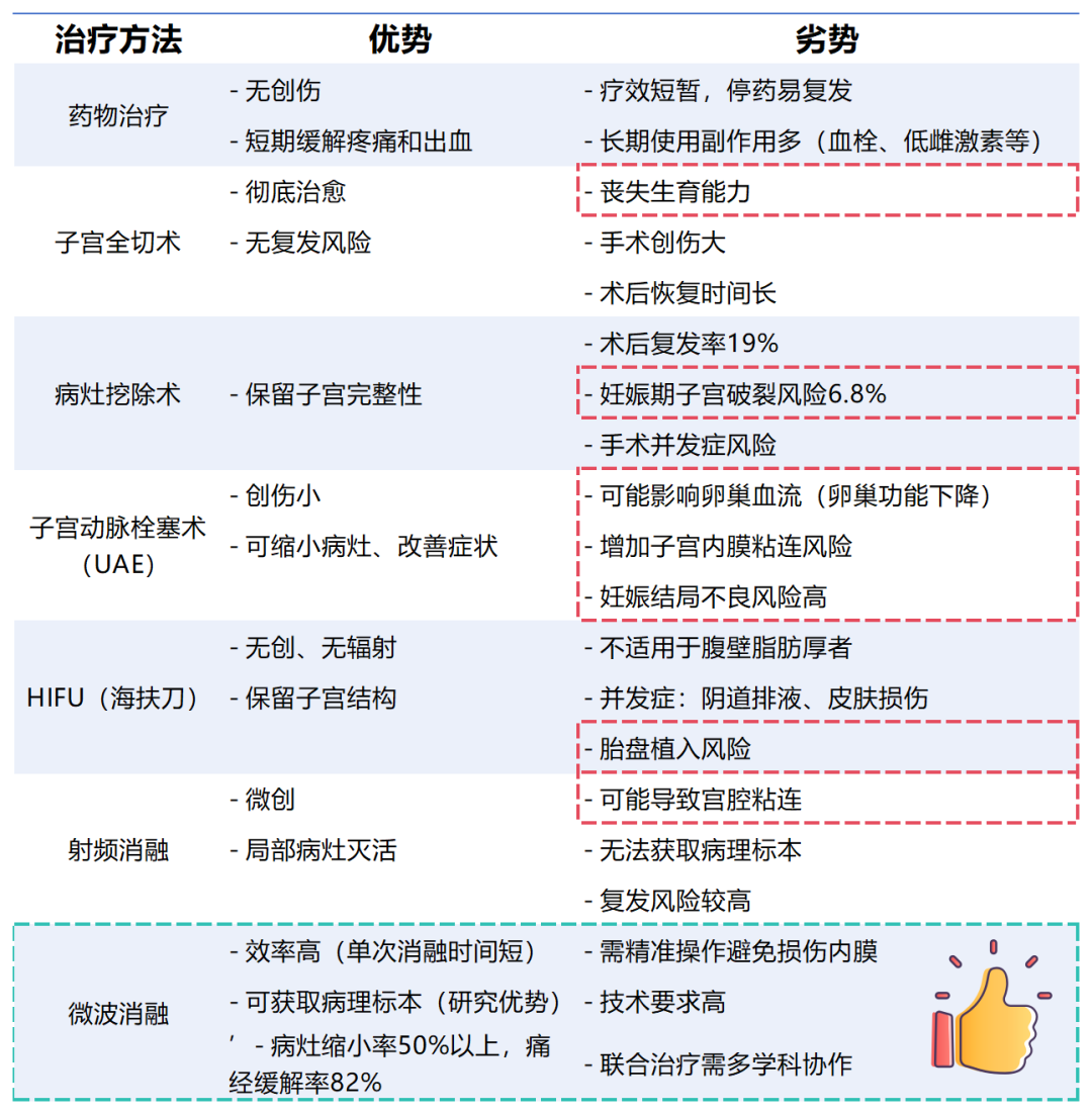 通过微创介入的方式,以较短的手术时间灭活病灶,减少病灶体积并改善子宫环境以利于胚胎着床,辅以局部注射聚桂醇破坏病灶血管,抑制病灶再生,从而达到巩固治疗效果。与其他子宫腺肌症的常规治疗手段相比,该项创新性技术(微针消融+聚桂醇消融)拥有时间短、创伤低、恢复期短、生育友好等优势。这对于有生育需求的子宫腺肌症患者而言,无疑是理想的治疗方案。但值得注意的是,采用微针消融(+聚桂醇消融)的手术方法非常考验操作者的技术以及消融医生和生殖科医生的配合。