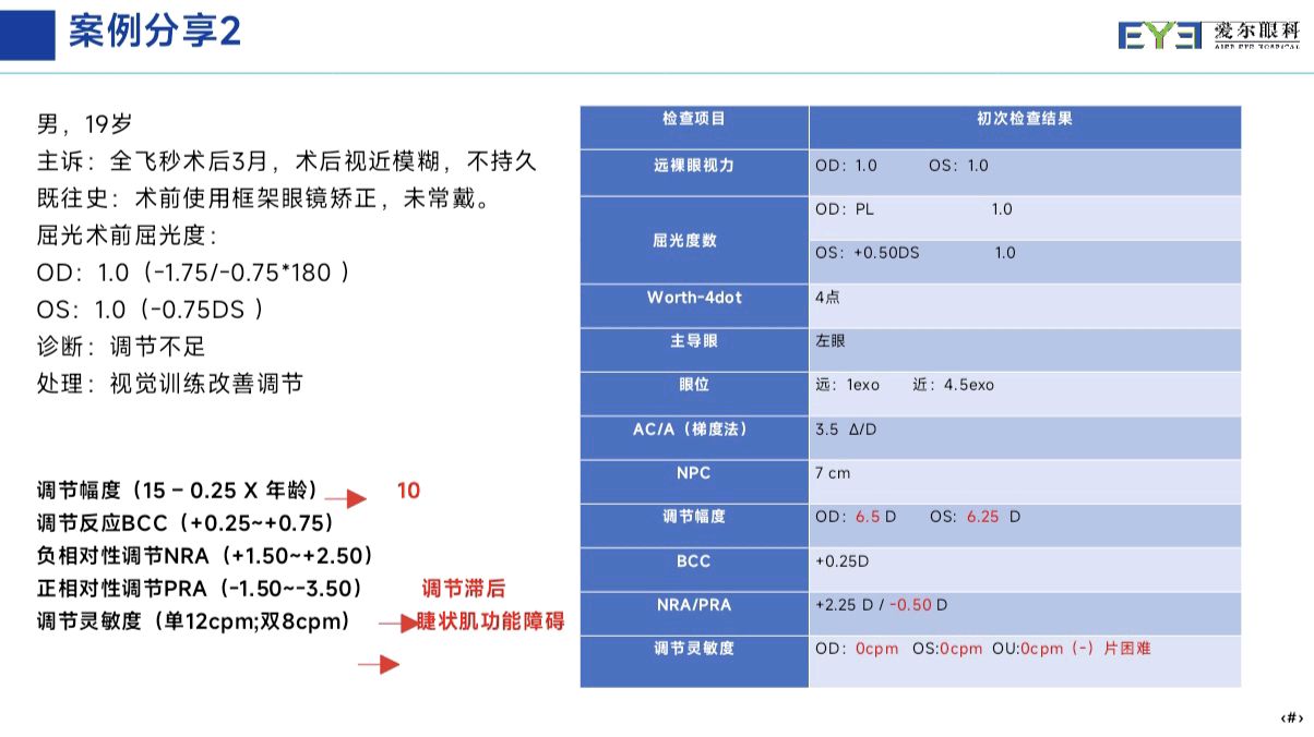术后3个月,术后视近模糊,不持久。检查调节幅度低,PRA调节储备严重不足,调节灵敏度为0。
