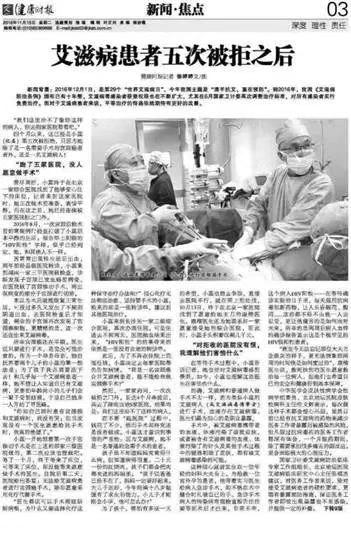 人民日报社、健康时报报道康楷为罹患宫颈癌的艾滋病患者手术的事迹