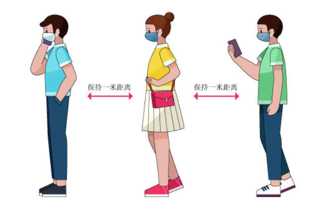 在人群密集或通风不良的场所,佩戴口罩可以有效减少病毒传播。自己或他人出现咳嗽、发热等症状时,尽量保持1米以上距离。