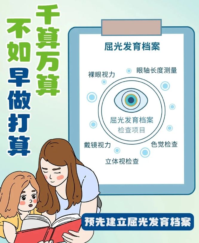 同时还需要通过定期的视力情况检查,记录屈光度、眼轴长度、角膜曲率等眼部参数,其中屈光度包括球镜(近视或远视)和柱镜(散光)度数,形成长期性的眼健康记录,建立儿童青少年屈光发育档案,通过比对多次的眼部参数变化,持续追踪监测视力情况,能够及时发现近视的苗头,采取必要的干预措施,避免或延缓近视的发生。