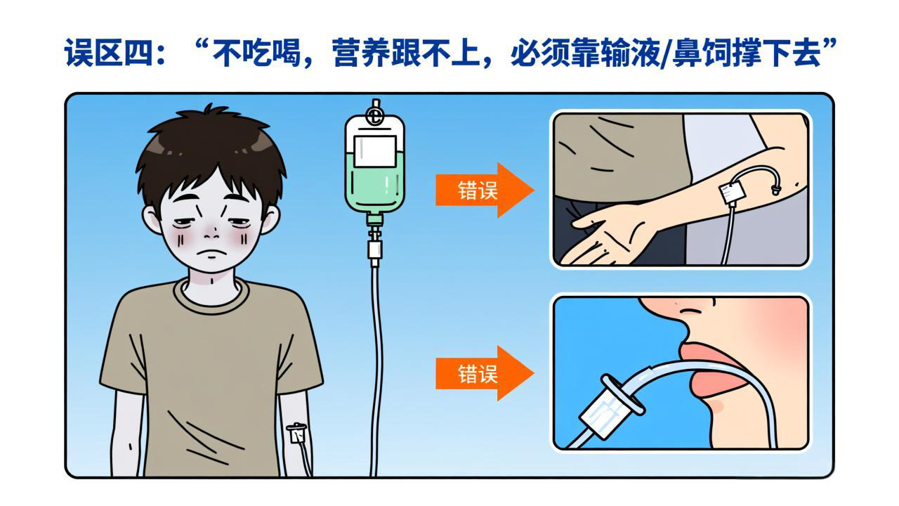 误区四:“不吃喝,营养跟不上,必须靠输液/鼻饲撑下去”