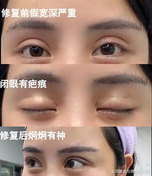 这位顾客6年前在外院做的全切双眼皮,术后双眼皮线条不对称,假宽深严重,闭眼有疤痕,睁眼费力。根据她的情况,给出以下方案:1、宽改窄,在现有基础上要低2mm左右;2、肌力重做调整,力量稍微加一点,但将原来的提肌位置适当的往下放一点,松一点,整个眼神不再是紧绷瞪眼的感觉,要更加的柔和。3、疤痕会切掉,重新进行精细缝合。
