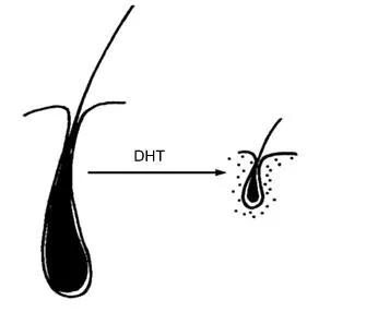 DHT是由睾酮与人体内5α还原酶反应后生成的一种产物。当DHT过量时,会引起毛囊失去动力,粗壮的毛发会变得细软、易脱落,直到最后毛囊停止生长毛发,形成大面积脱发,头皮裸露的现象,这就是雄激素性脱发,也称脂溢性脱发,是脱发的主要类型。