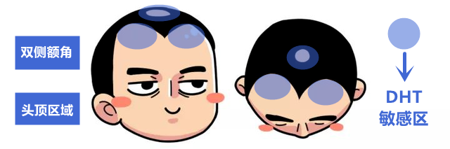 受遗传影响,人头顶和前额的毛囊是DHT受体的集中营,更容易受雄性激素影响,毛囊对DHT耐受力更差。