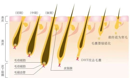 其脱发的原因是因为雄激素导致毛囊病变,和遗传因素有很大的关系,它不是男性的专利,女性也有。