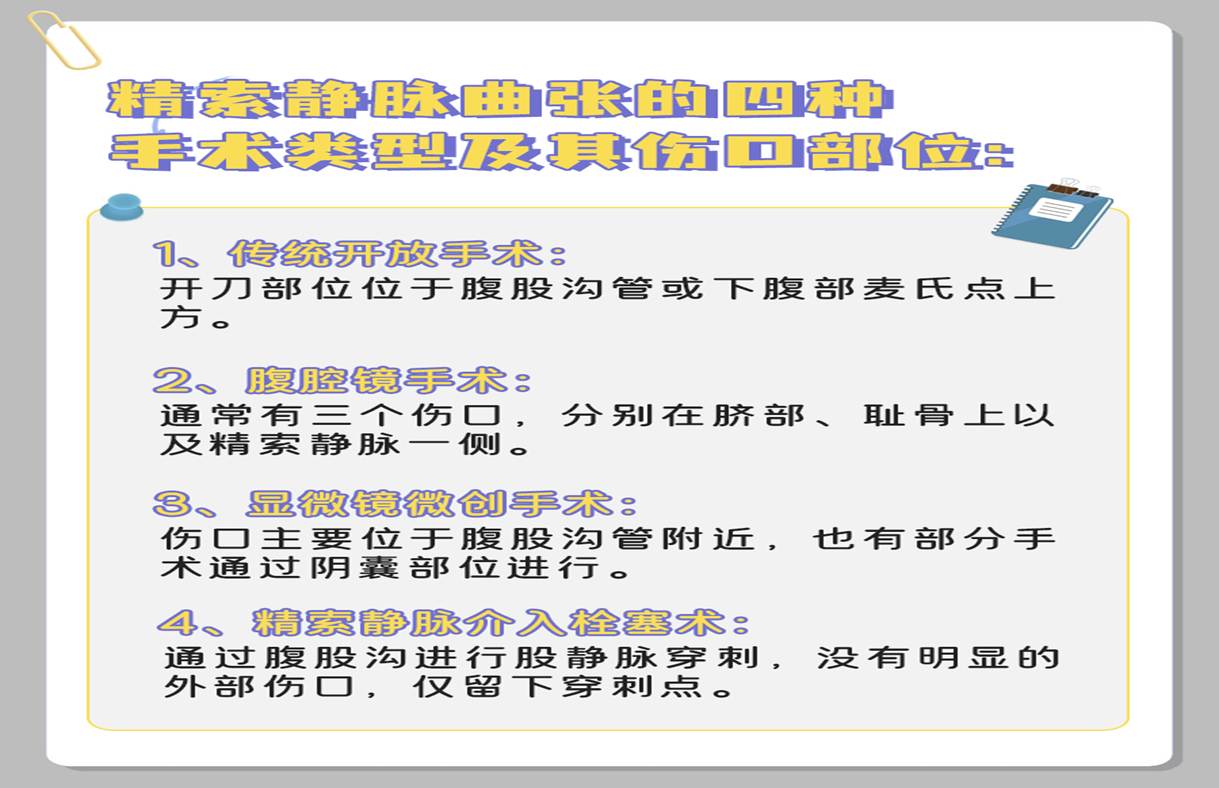 手术方式:腹股沟切口的高位结扎术、腹腔镜高位结扎术、改良的腹股沟局麻小切口高位结扎术、显微镜下精索静脉低位结扎术、精索静脉介入术等。