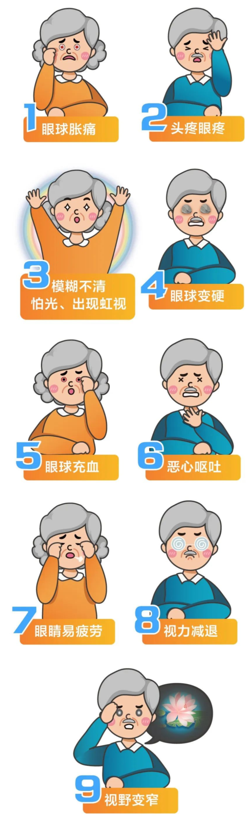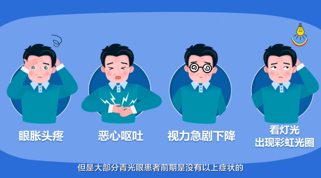 虽然青光眼致盲不可逆,能及早发现、及早治疗,患者仍可较大限度地保存有用视力,维持正常的生活和工作。所以,一旦发现有以下症状,建议尽快到正规医院就诊。