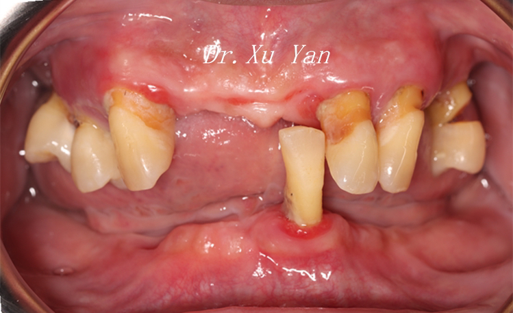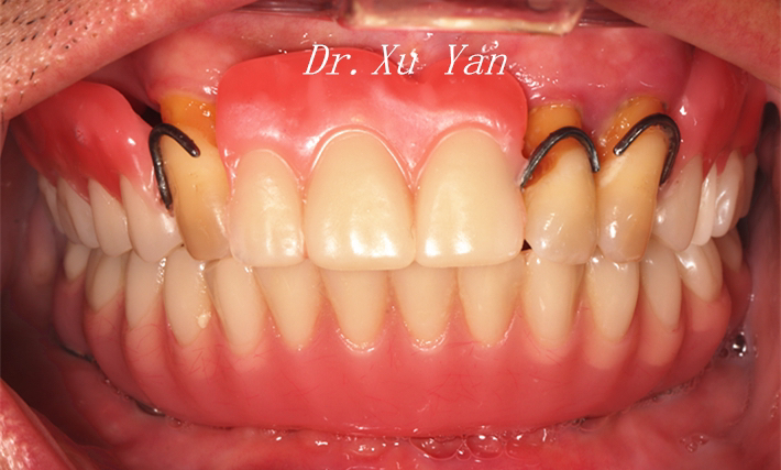 1. 上颌: 拔除松动牙后重新制作活动义齿,改善其固位、稳定性和美观。