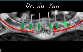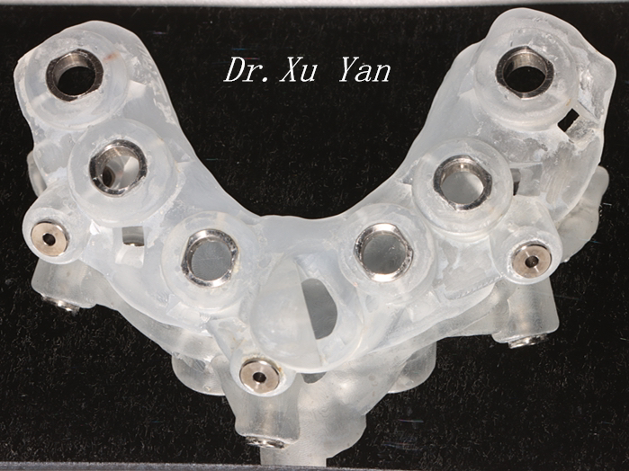 2. 下颌:固定修复。微创拔除下颌剩余牙,彻底清创。刃状牙槽骨进行削平修整,在数字化种植导板引导下,不切开翻瓣,于理想位点即刻植入6颗骨水平种植体。当天戴入临时固定修复配件,一周后负重咬物。