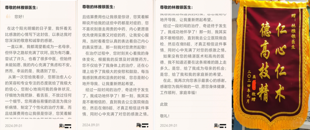 上方温经汤微调共服用5周后,患者于2024.7.29查尿妊娠阳性。2025年4月上旬顺利生1女。终于成功了,患者很激动,写了一封感谢信予我,还赠送了我一面锦旗表示感谢。