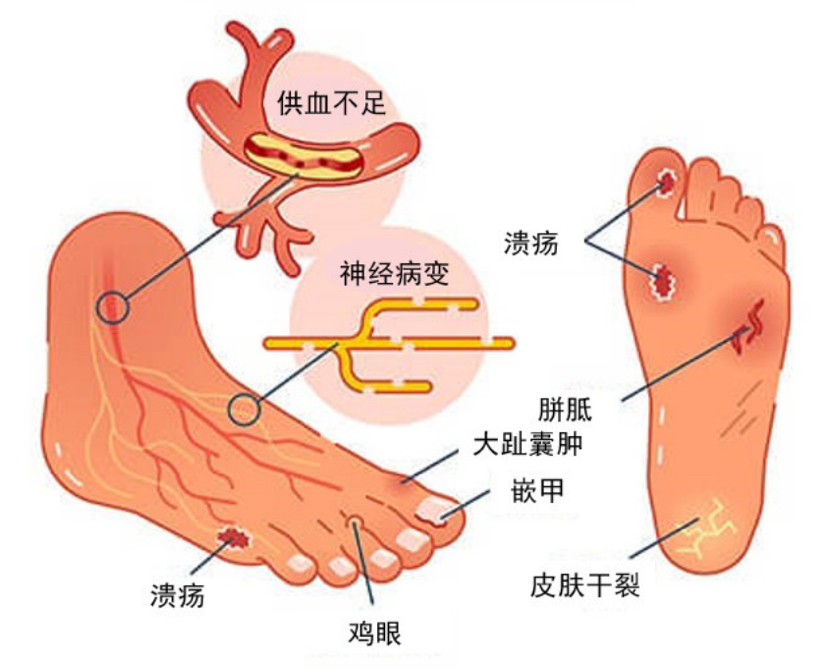 2.足部并发症:神经病变可能导致足部感觉丧失,使得足部受伤和溃疡风险增加,严重者甚至可能导致截肢。