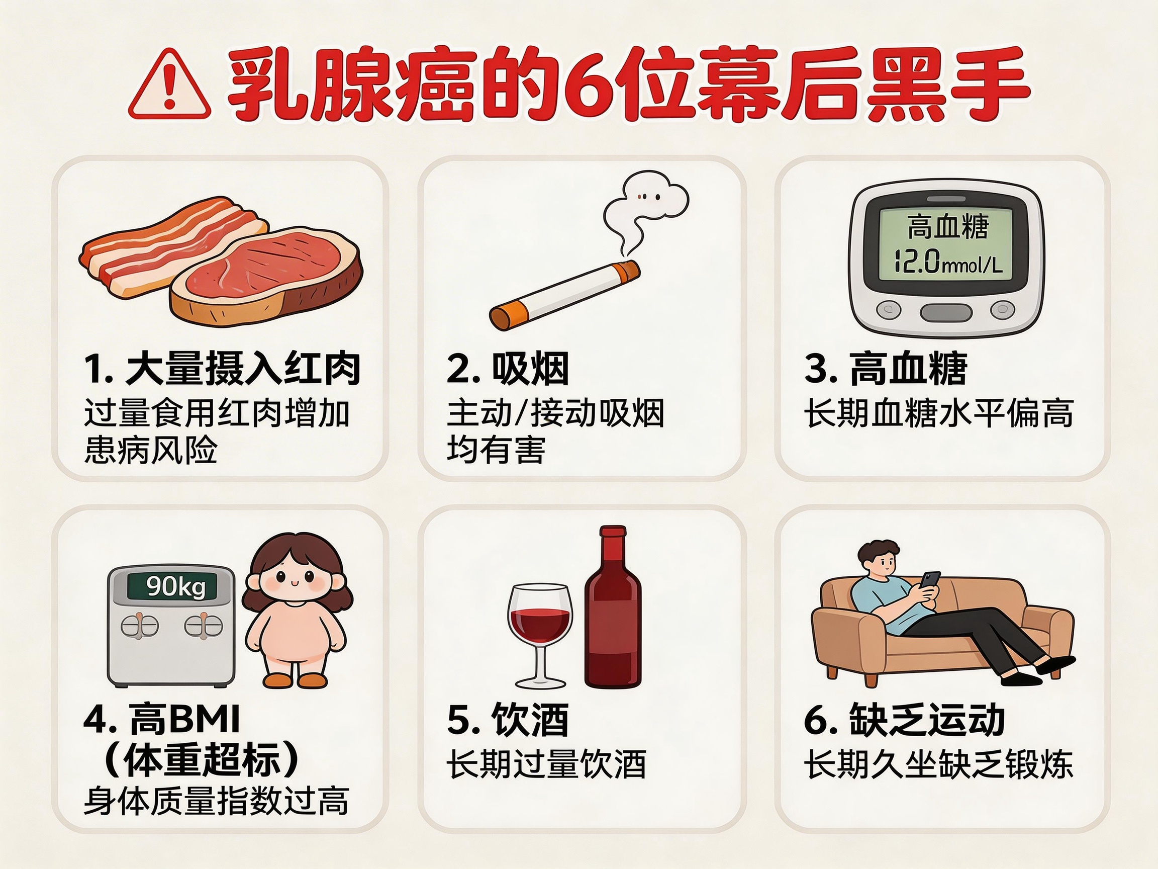 这六位“幕后黑手”是谁?说出来你可能觉得太普通了:大量摄入红肉、吸烟、高血糖、高BMI(体重超标)、还有饮酒。