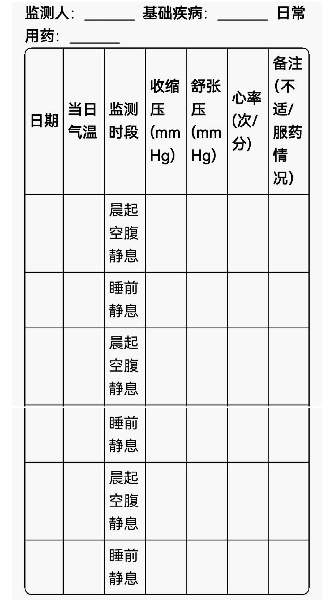 每日早晚测量双上肢血压,记录波动情况;遵医嘱服用长效降压药(如氨氯地平、缬沙坦),避免漏服;7室温保持18-22℃,避免突然暴露于寒冷环境。