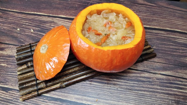 2、银耳泡发后切碎,然后和枸杞、冰糖一起放入南瓜中;