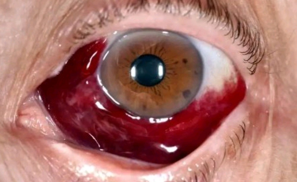 初诊可见患者情况并不需要我们特别担心,仅仅是左眼结膜下出血(图片来源于网络)。