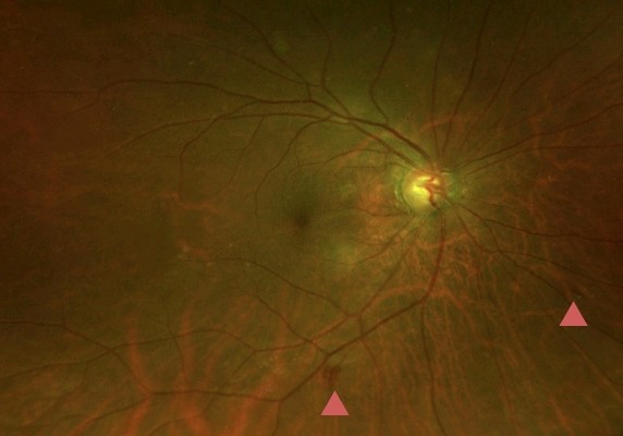 果然在之前做过手术的右眼(此时视力很好,保持在1.0)发现了早期的糖尿病视网膜病变。三角形箭头所指即为散在可见的线状及小片状出血。