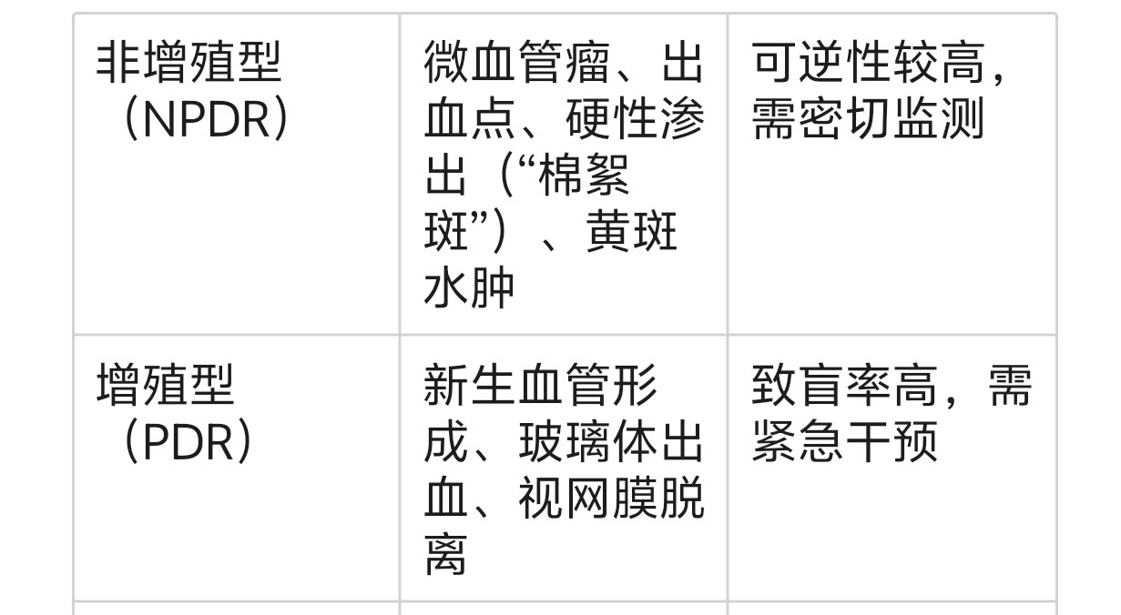 增殖期(PDR): 激光光凝:全视网膜光凝(PRP)封闭缺血区,阻止新生血管增生;玻璃体切割术:清除玻璃体积血、复位脱离的视网膜(晚期挽救视力)。