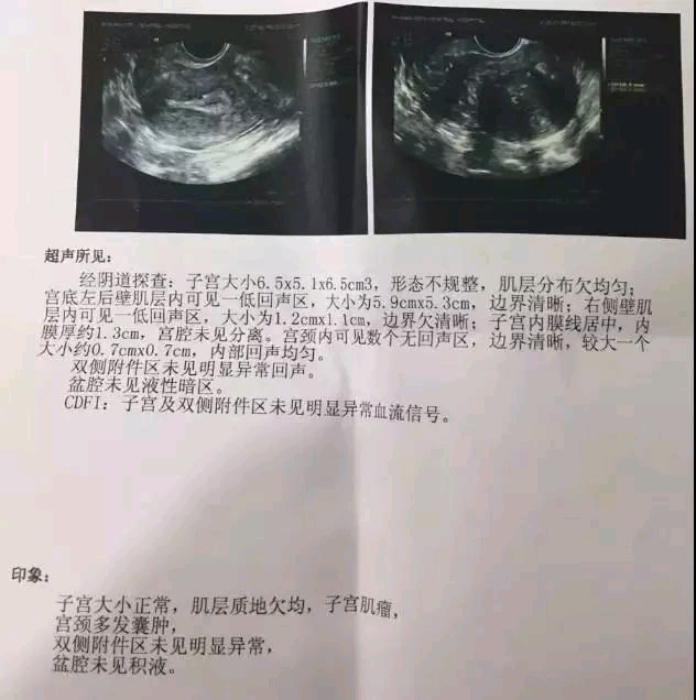 比较常见的是这样的报告,主要就是由超声检查的描述+结论+配图构成,配图会包括在检查中发现的子宫肌瘤的图像,当然在某些地区,超声的报告是没有配图的,只有超声描述和结论。省略掉配图的原因除了本身检查的价格可能无法覆盖掉打印的成本外呢,可能还有一个原因是超声科医生会觉得临床医生只是看一个结论。