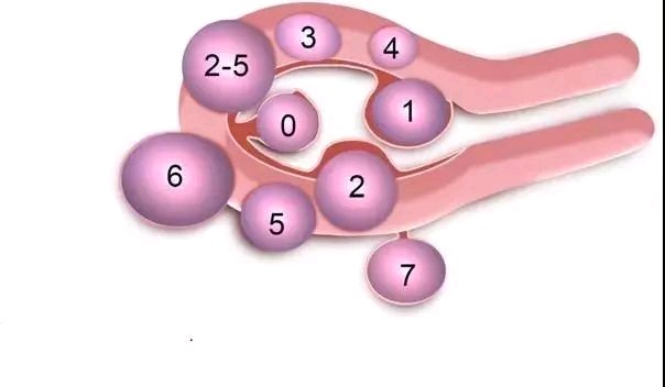 其实超声检查, 的确是非常适合妇产科的一个检查手段,通过经阴道的超声,可以清晰直观的显示子宫及附件的情况,但超声的检查获取的是一个动态的过程,仅仅靠文字记录,哪怕加上配图,是无法完整的还原这个检查过程获取的信息量的。举个简单的例子,子宫肌瘤在超声报告内一般会描述为粘膜下、肌壁间、浆膜下3个位置,但实际的临床应用中,我们目前更偏向于使用figo的分型,把子宫肌瘤分为0-8型(如下图,8型为特殊位置肌瘤,图中并未画出)。