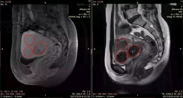 除了提供肌瘤的位置外,MRI还可以提供给我们很多别的信息,通常一个方向的T2加权序列会给我们提供大概26张甚至更多的图像,足够完整的显示子宫不同层面的情况,以及和周围的肠道、膀胱等组织脏器的关系,并且通过在T2加权下子宫肌瘤和子宫肌层信号的差异,能够初步判断这个子宫肌瘤是否适合我们目前开展的磁波治疗,如果是高信号(表示组织本身含水丰富或者血供丰富),那么做磁波治疗效果可能就不会太高,自然选择其他的方式就会更合适。