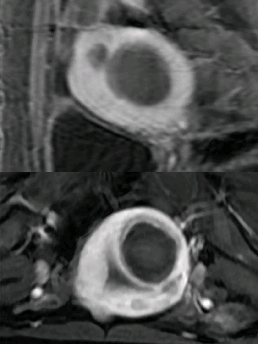 上图是我们一个子宫肌瘤的患者磁波治疗术后复查的MRI图像,这个患者在术后1年左右怀孕,计划分娩的时候问我是否可以顺产,你可以图片里面可以看出来,黑影的坏死部分局限于子宫肌瘤的内部,而周边的子宫内膜和肌层均保留完好,这样的子宫自然分娩没有问题,当然产科一些指征需要剖宫产的另当别论。