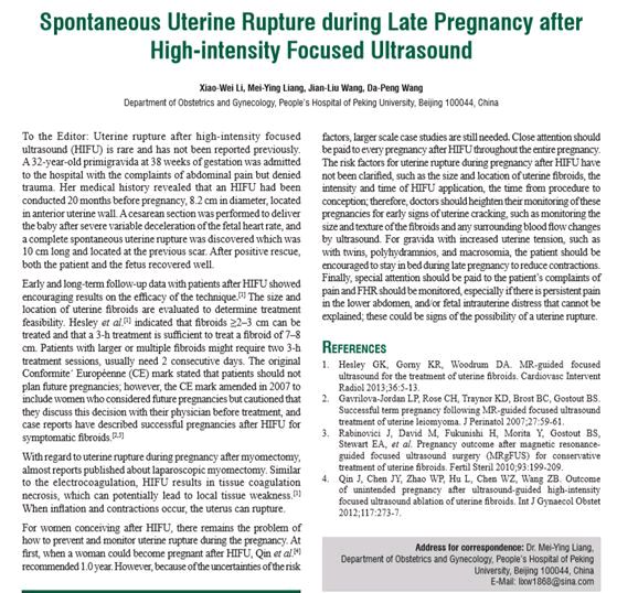 病例2,是北大人民医院报告的一例海扶术后妊娠期子宫破裂的案例,8cm子宫肌瘤患者,在海扶治疗后20个月怀孕,但是在38周的时候发生子宫破裂。回顾患者的MRI可以看到子宫肌瘤治疗的时候,发现虽然子宫肌瘤治疗比较彻底,但是子宫肌瘤外面正常的子宫肌层也受损了,因为缺乏有效的肌层承受孕期胎儿增大后的压力,发生了妊娠期的子宫破裂。虽然此例母胎都安全,但是妊娠期子宫破裂仍然是一个高风险的事件。