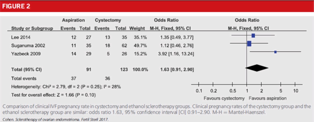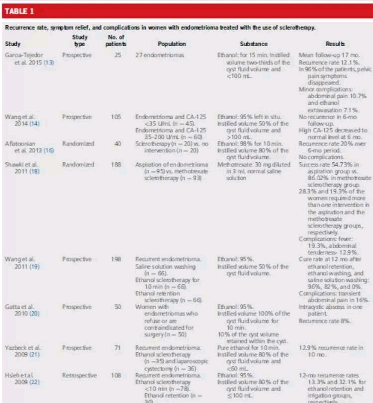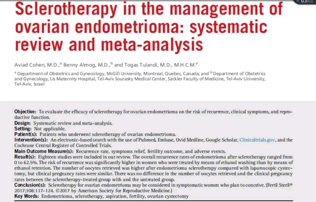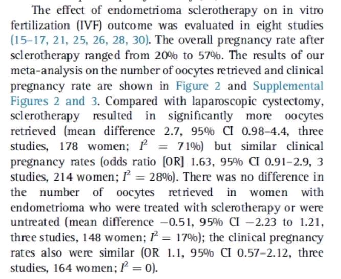对研究有兴趣的可以查阅下这篇Meta分析的结果(Fertil Steril 2017;108:117–124. 2017 by American Society for Reproductive Medicine,所谓Meta分析,中文称之为荟萃分析,是汇总很多临床研究的结果的文献,相对于某个专家的个人言论或者一个临床病例总结或者某个病例对照研究,结论更为可靠。)从治疗效果上来评估,囊肿硬化治疗还是不错的,80-90%的囊肿都可以得到治愈,哪怕这个治愈比率在50%,我都觉得对病人来说是很好的尝试,穿刺毕竟损伤很小。从治疗以后卵巢功能的保留上来说,相对于腹腔镜手术,囊肿穿刺硬化术后进行取卵获得卵子的数量还要多于腹腔镜手术,这也就意味着对于卵巢功能的损伤,囊肿穿刺会更小些(腹腔镜手术过程中剥离囊肿的过程会切除掉部分正常的卵巢,加上一些电损伤,卵巢功能也多多少少会受一些影响)。当然,囊肿穿刺并非没有风险,作为有创治疗手段之一,也是会有一定潜在的风险的,譬如如果硬化剂外溢导致的腹膜炎症状(所幸发生率不高)。