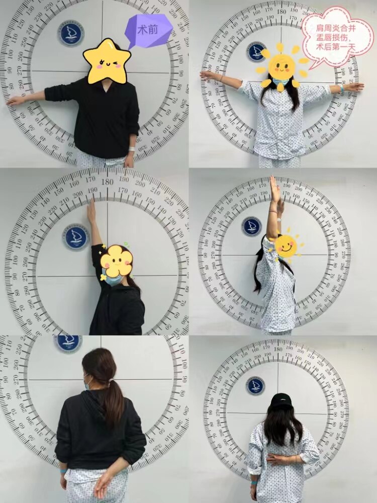 手术当晚自述疼痛明显改善,术后第二天经过几次康复练习,肩关节活动角度明显改善,如图。