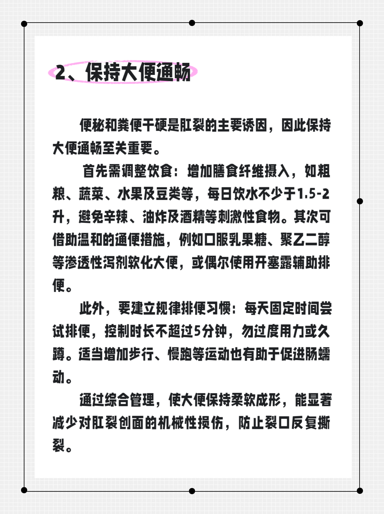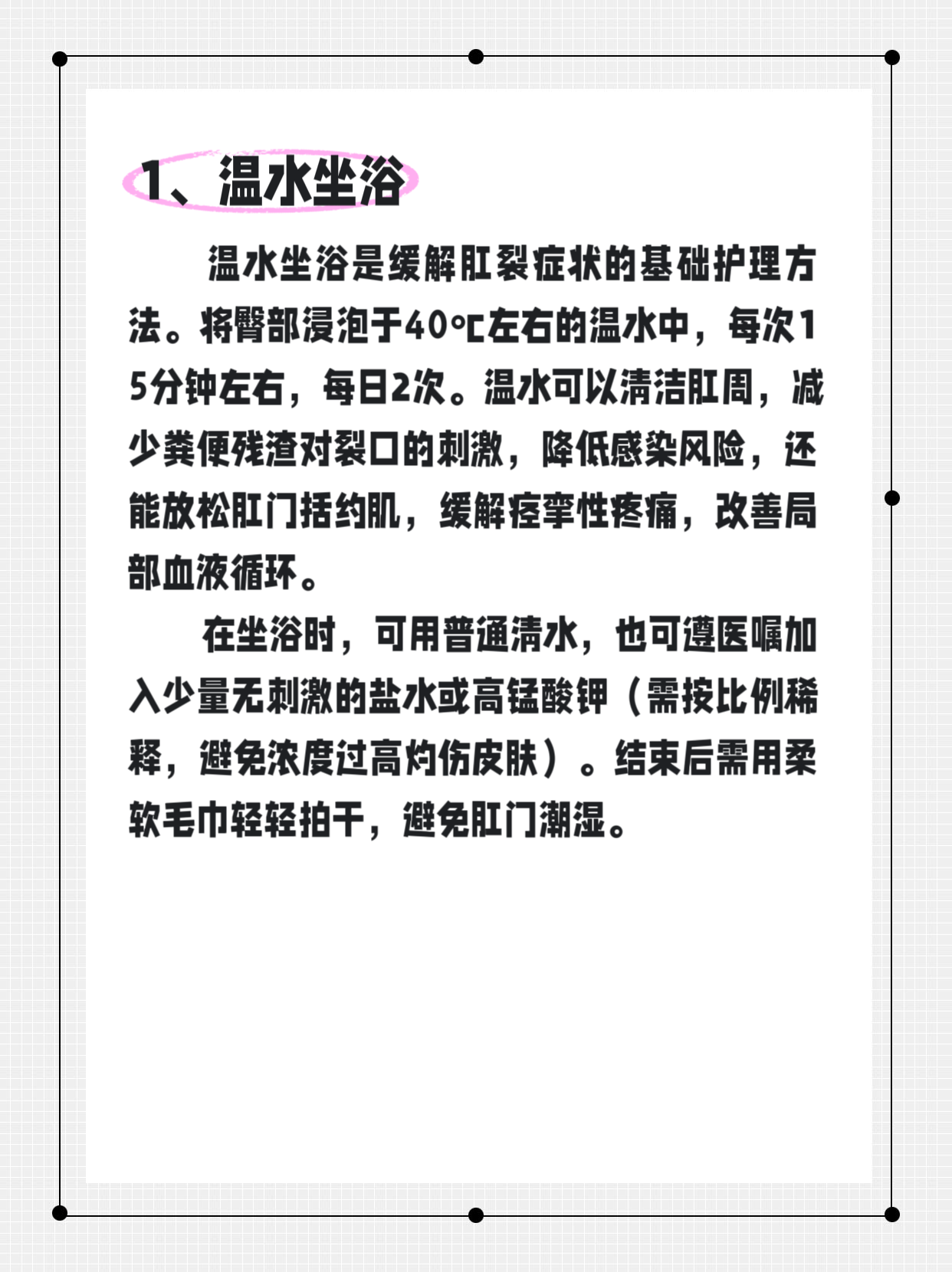 肛裂是肛门内壁黏膜的撕裂或溃疡,常由便秘、大便干硬或排便过度用力引起。其典型症状包括排便时剧烈疼痛、便后持续灼痛及便纸少量鲜血。多数急性肛裂可通过科学的自我护理促进愈合,从而避免形成慢性肛裂,如果大家有肛裂的困扰,就来学习一下如何在家护理吧!