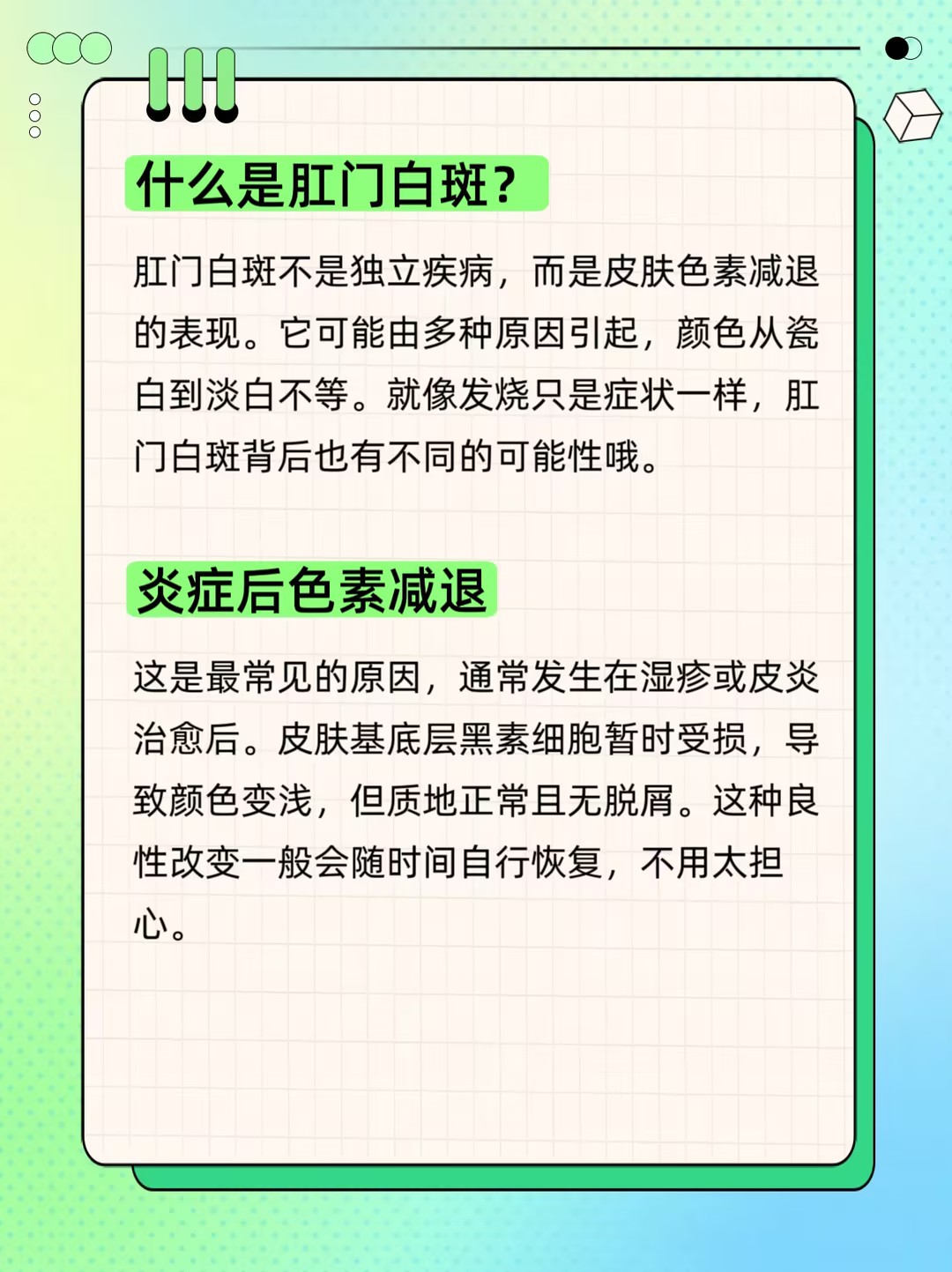 “肛门口长了一块白斑,看起来有点吓人……”如果你在洗澡或擦洗时无意中发现肛门周围皮肤颜色变浅,出现一片或几片白色斑块,心里难免会犯嘀咕:这是什么?是白癜风吗?会癌变吗?需要治疗吗?今天,我们就来科学、客观地解读“肛门白斑”,帮你消除不必要的恐慌,并理清正确的应对思路。