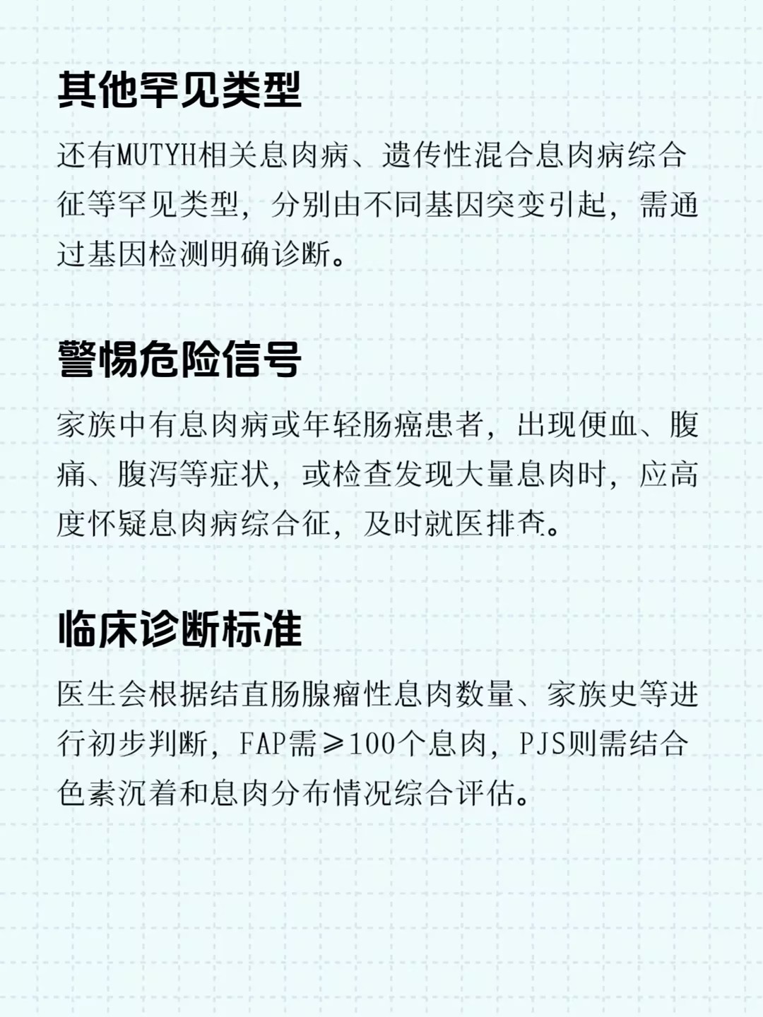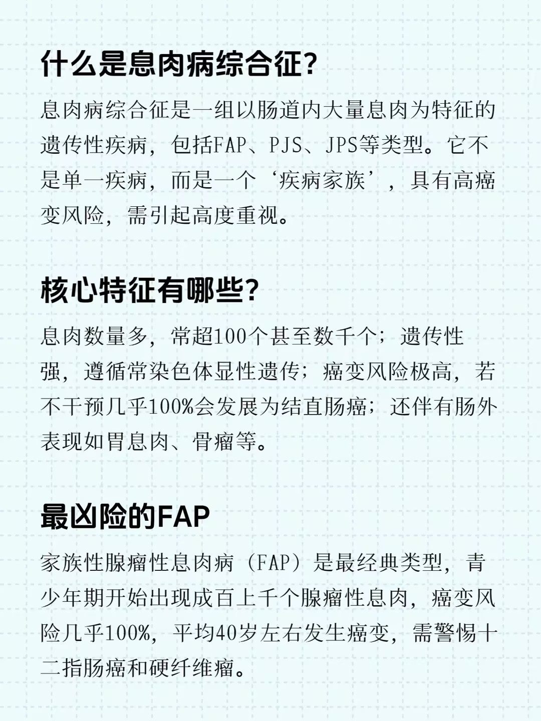 "医生,我肠镜发现十几个息肉,这正常吗?""我爷爷、爸爸都得了肠癌,我会不会也……"在肛肠科和消化科门诊,这样的担忧并不少见。当肠道里出现成百上千个息肉,这往往不是简单的"多发息肉",而可能是一种遗传性疾病——息肉病综合征。它像一颗埋在肠道里的"定时炸弹",如果不及时干预,癌变风险极高。今天,我们就来系统认识这个需要家族警惕的疾病。