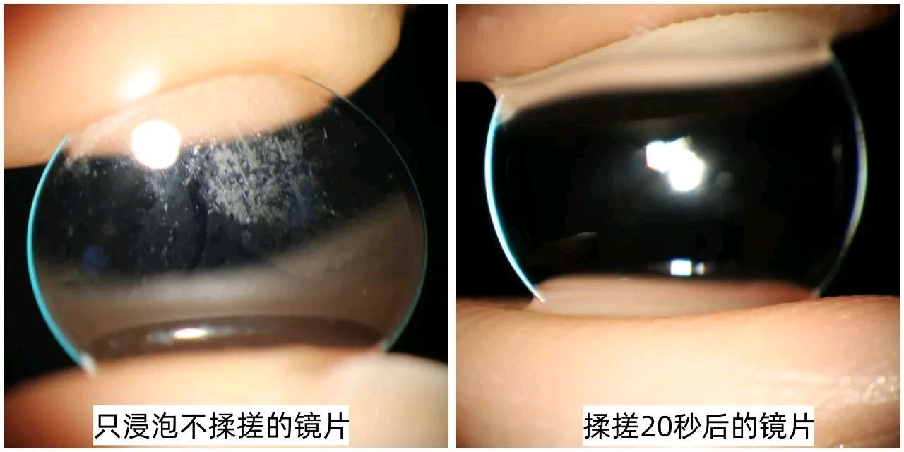 为了保证戴镜安全及镜片清洁,每次戴镜前和摘镜后,应该将镜片放在掌心,滴上护理液,用无名指指腹放射状揉搓镜片20秒以上,冲洗干净后再进行操作。