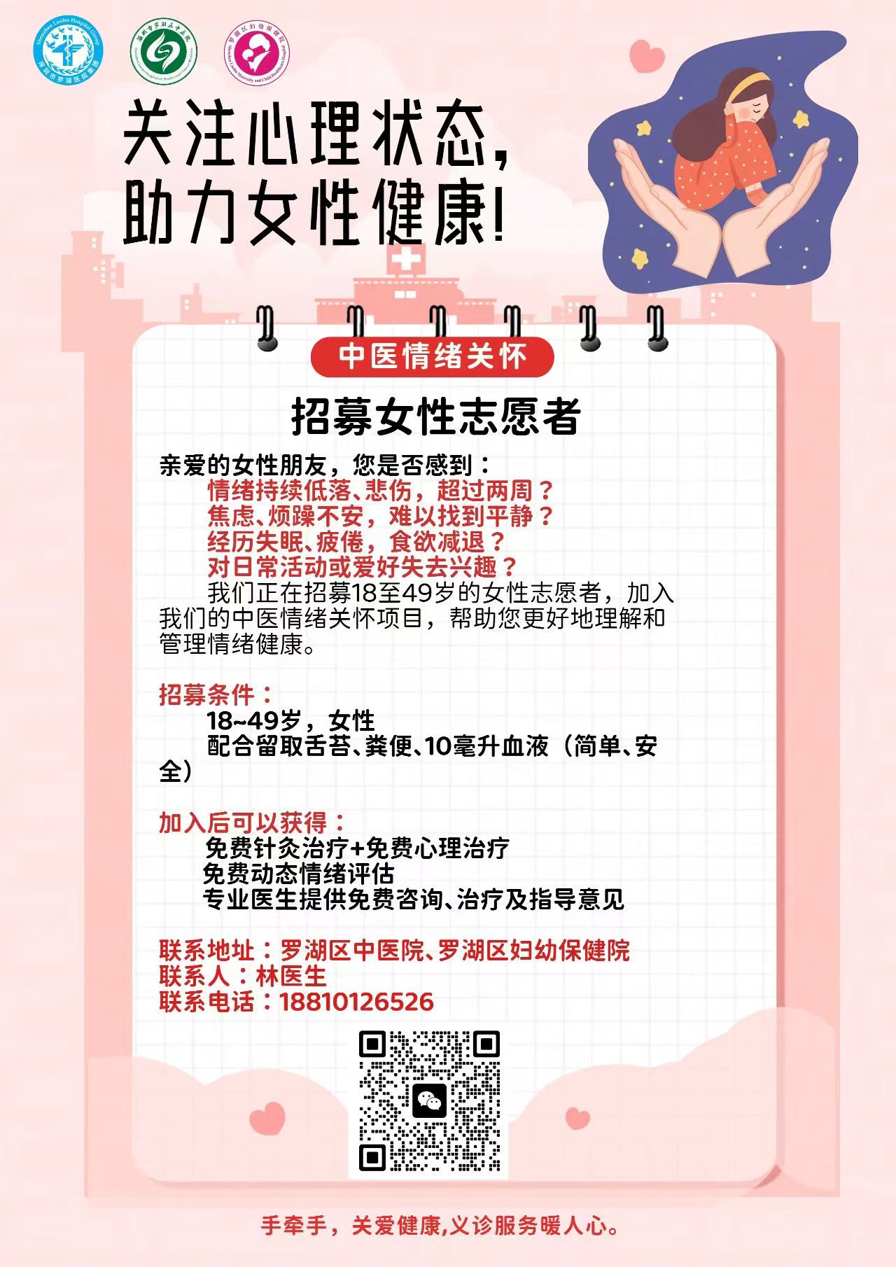 我们正在招募18至49岁的女性志愿者,加入我们的中医情绪关怀项目,帮助您更好地理解和管理情绪健康。