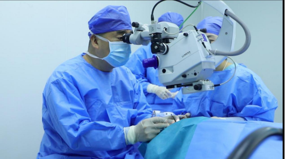 家属的嘱托、患者对光明的渴望,让王建文院长深感责任重大。在为患者积极控制血糖、眼压等各项指标,并做好充分的手术筹备工作后,2025年4月11日,王建文院长为张先生实施了“右眼白内障超声乳化抽吸+白内障摘除伴人工晶体一期植入+青光眼阀植入+视网膜病损激光凝固术”。经过近一个多小时的手术,王院长凭借精湛娴熟的操作成功赢下这场“光明保卫战”。