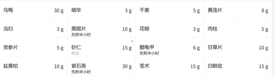 黄连5 当归20 鹿角霜15 全蝎10 吴茱萸5 肉桂15