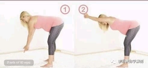 1.站立位,双手举过头顶,慢慢的弯腰,如图中所示。每天坚持做8-10次,数量依据个人体质和当时身体状态决定(做之前请咨询您的医生)