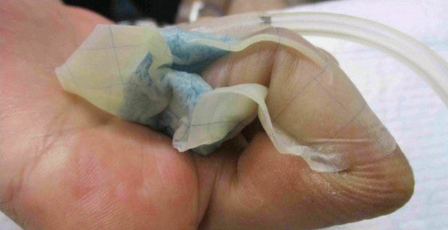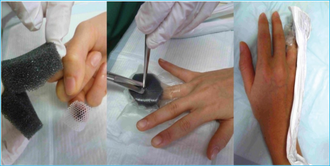 具体操作1、先在截肢创面敷上非粘性纱布,防止创面与装置粘连引起疼痛;2、然后将海绵泡沫裁剪成合适大小覆盖创面,再在海绵上方覆盖薄膜防止漏气;3、最后用管子将海绵与 NPWT 装置相连,进行持续负压吸引(如图 1)。4、每周使用 NPWT 装置 1 到 2 次,直至手指截肢创面完全上皮化。5、在重新使用 NPWT 装置过程中,不采用常规镇痛方案,仅在需要时给予口服非甾体抗炎药等镇痛药。图片图1. 在指端创面上放置一块非粘性纱布,并用海绵泡沫覆盖。海绵泡沫由一层薄膜覆盖,并通过一根管子与负压伤口治疗