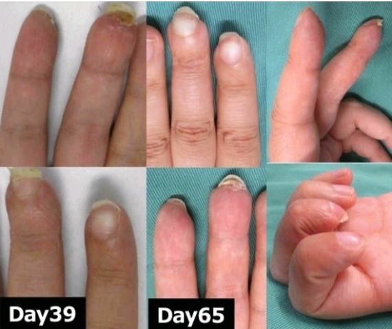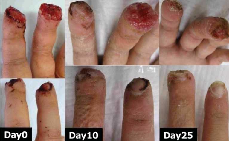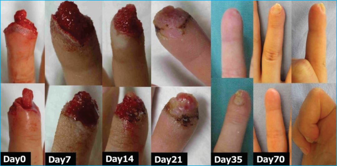(NPWT)装置相连。病例1:一名21岁女性,因右无名指外伤性指端离断就诊(图2)。远节指骨外露,但为了保留手指长度,未进行骨切除。受伤次日安装负压伤口治疗(NPWT)装置,指端创面在受伤后35天内愈合。外露的远节指骨被肉芽组织覆盖,上皮化完成。患者对指尖外观满意。图片图2. 外露的远节指骨被肉芽组织覆盖,上皮化已完成。病例2:一名24岁女性,左示指和中指外伤性离断(见图3)。受伤一天后安装了负压伤口治疗(NPWT)装置。示指在17天内愈合,中指在25天内愈合。这是唯一一例进行局部麻醉的病例,因为患者在重新安装NPWT装置时感到剧痛。 图片图片图3. 食指在第17天显示愈合,中指在第25天显示愈合。结果6 根 Tamai Zone 1 手指平均 22.7 天(17 - 35 天)实现上皮化。上皮化后患者感觉知觉稍有下降,但 3 个月后恢复良好,两点辨别测试、关节活动范围和握力均正常。指甲轻微变形缩短但再生良好,无伤口感染、神经瘤等并发症。患者受伤 2 个月后恢复工作,对指尖外观满意。图片图4. 患者即使手指上连接着负压伤口治疗(NPWT)装置,仍在进行关节活动度训练。讨论年轻患者伤口愈合能力强、血供良好,NPWT 的负压刺激促进血管生成、组织肉芽生长并防感染。与其他治疗相比,NPWT 允许患者在治疗时进行关节活动训练,不限制活动范围,无需供体部位,能在较短时间内实现上皮化,且手指垫再生美观。研究表明,NPWT 有望成为外伤性手指截肢的新型保守治疗选择,尤其对年轻患者,可能无需截骨即可实现愈合,但仍需更多病例验证。