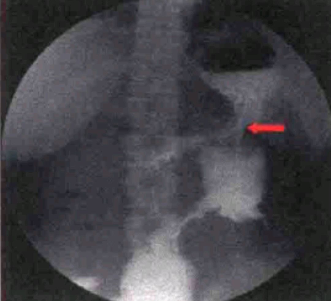 现病史:自诉1年前无明显诱因出现上腹部疼痛,为间歇性隐痛,无明显放射性疼痛,疼痛尚可耐受,故一直未予特殊治疗,未到医院检查过,半月前开始出现出现恶心、呕吐,呕吐物为棕黑色浑浊样液体,伴粪臭味;同时开始出现腹泻,约4~ 5次/日,最多达20次/日,性状与呕吐物类似,偶有排出未消化食物,为求治疗遂来我院就诊,近半年来体重下降约10 kg。