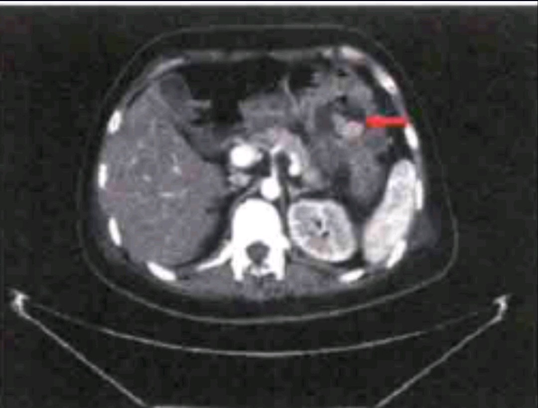 辅助检查:腹部增强CT示:左上腹腔内结构紊乱,可见团状含气软组织密度影,增强后呈不均匀强化,边界不清,局部与胃体部分界不清, 似与横结肠及降结肠相通,病灶周围可见游离的气体影,相邻脂肪间隙模糊(图箭头所示为疑似的胃结肠瘘)。