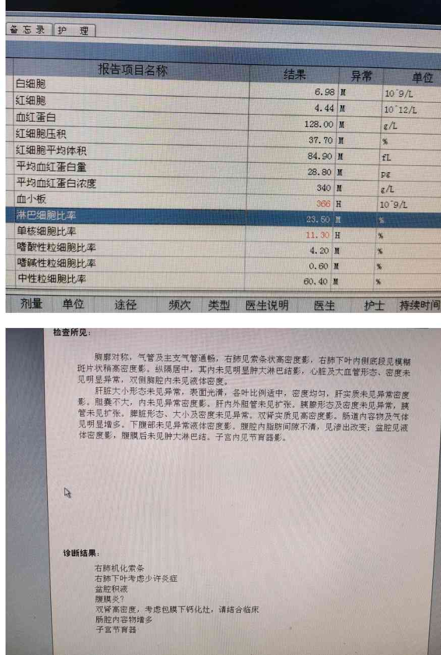 2.腹膨隆,未见肠型及蠕动波,腹壁静脉无曲张,无瘢痕,腹壁软,下腹部压痛,右侧腹部压痛为重,伴反跳痛,局限性肌紧张,全腹未触及包块,肝脾肋下未触及,墨非氏征阴性。肝区无叩击痛,无移动性浊音。肠鸣音正常,平均3次/分。3.本院三期增强腹部CT,扔无明显异常表现,昨日来我院就诊,入院血常规归于正常,行全腹CT:盆腔积液,脐周可见炎性渗出影,右肺下叶考虑少许肺炎。妇科彩超:未见明显异常。