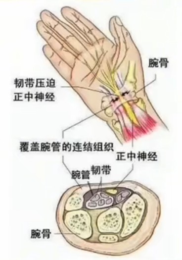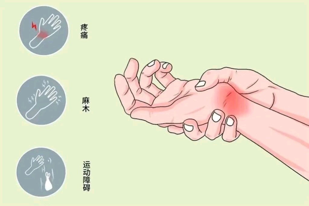 A:记住三个关键词——麻、痛、夜不能寐!·麻:拇指、食指、中指和环指桡侧像过电一样麻,手怎么放都不得劲;·痛:手腕一弯就痛(比如端碗、拧瓶盖);·没劲:手没力气(握笔、拿筷子都变得困难)。