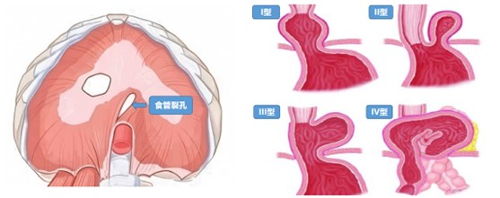 二、食管裂孔疝的特点食管裂孔疝是最常见的膈疝,占比可达90%。可分为1—4型。小食管裂孔疝(1型),是贲门或小部分胃向上进入胸腔,常见症状就是胃食管反流,表现为反酸、烧心、胸疼、哮喘、咳嗽等;大食管裂孔疝(2—4型),是大部分的胃,甚至整个胃、脾脏、胰腺和结肠都进入胸腔,导致胃部发生扭转,引发饭后腹胀、呕吐、剧烈上腹疼痛,有时会出现贫血、黑便等出血情况。