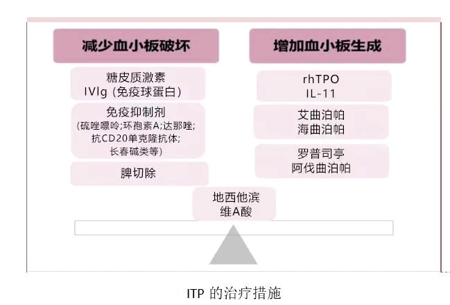 ITP目前尚无根治的方法,治疗以提高患者生活质量为目标,遵循个体化原则,应选用毒性最小的药物,维持血小板在安全水平以上,减少和预防出血。