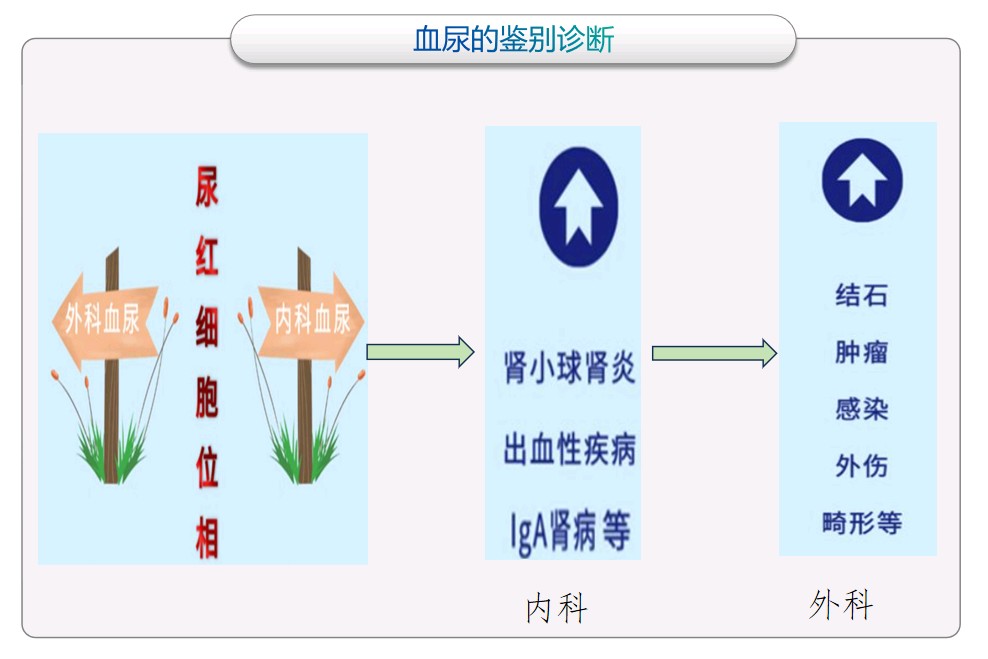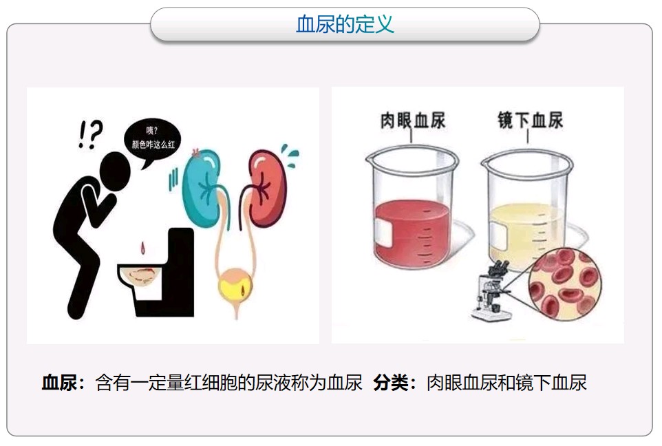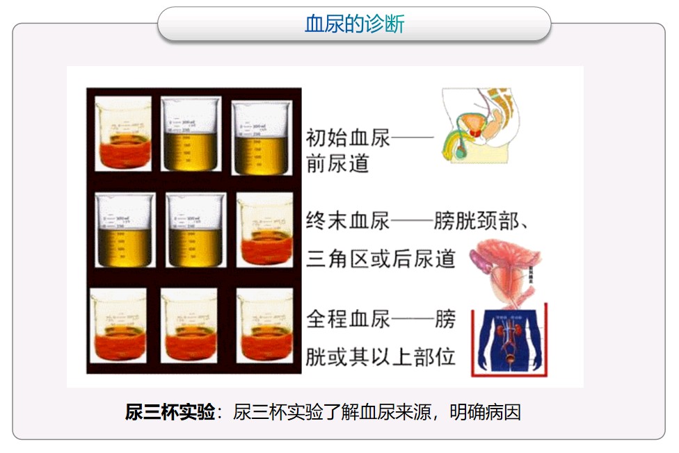 血尿是一个比较常见的症状,最重要的是找到导致血尿的“罪魁祸首”。导致血尿的原因有很多,需要我们进一步鉴别诊断。查尿常规发现尿中有红细胞及隐血时,一定要查清是什么原因引起的。首先要确定是“真性血尿”或“假性血尿”,同时采用较简便的尿三杯、尿红细胞相差显微镜和泌尿系超声等进行筛查。