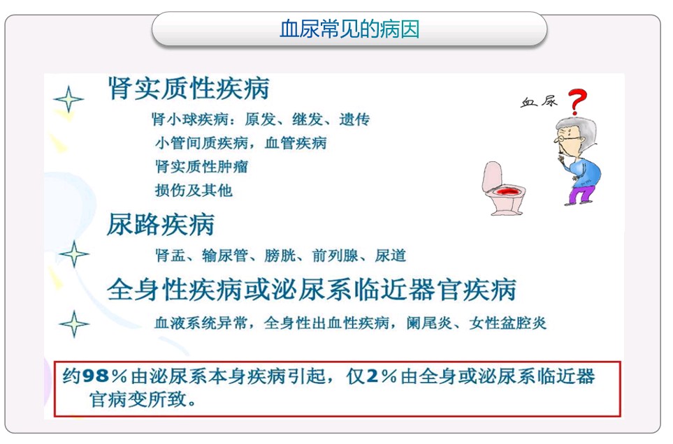 1多种泌尿系统疾病:常见的如肾炎、肾病综合征等肾脏疾病;泌尿系肿瘤,如肾肿瘤、膀胱肿瘤、输尿管肿瘤,甚至前列腺肿瘤都可以造成血尿;泌尿系结石,像肾结石、输尿管结石、膀胱结石可以造成血尿;泌尿系感染,也可以合并有血尿;前列腺增生,前列腺增生肥大到一定程度,也可以造成血尿。