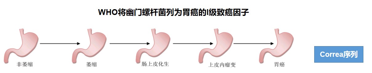 幽门螺杆菌是一种在胃的酸性环境下可以生存的细菌,并且它会释放各种各样的毒素,破坏胃黏膜屏障,导致胃病的发生。多数感染幽门螺杆菌的患者可能会经历一个非萎缩性胃炎、萎缩性胃炎、肠上皮化生、上皮内瘤变、胃癌的过程。但仅有极少部分会最终发展成胃癌,这个发展过程也非常缓慢,常常经历数十年。研究显示,在中国大约有超过50%的人存在幽门螺杆菌感染。世界卫生组织将幽门螺杆菌列为胃癌的I级致癌因子,90%的非贲门癌与幽门螺杆菌感染有关。