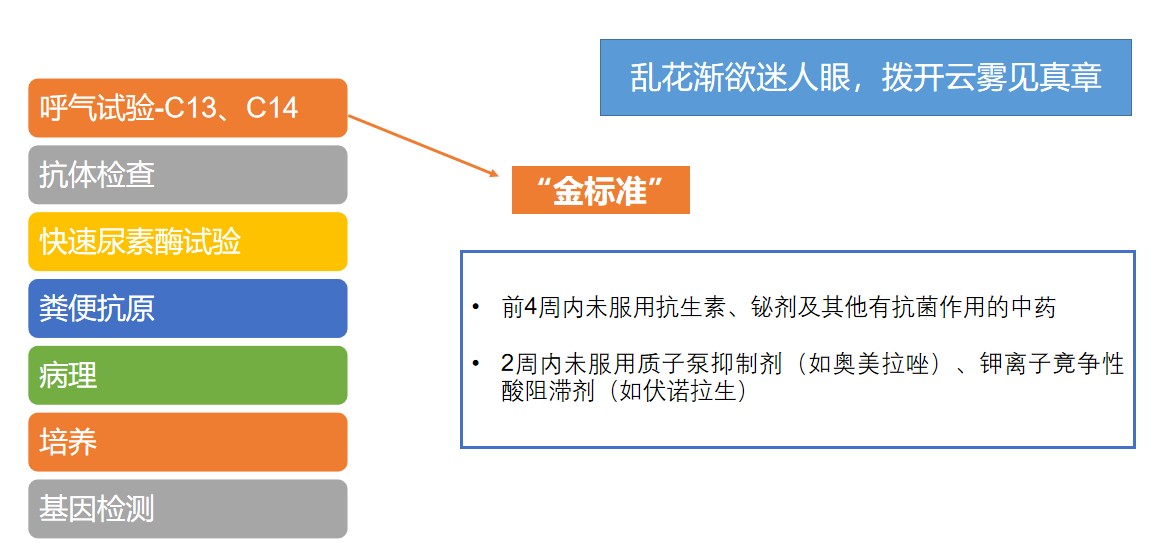 幽门螺杆菌的检查方式有很多,主要包括C13/C14呼气试验、快速尿素酶试验、血清学抗体检测、粪便抗原检测等。C13/C14呼气试验被认为是最可靠、最经典的检查方式,是国际上公认的幽门螺杆菌检查的“金标准”,便捷、安全,无论是确诊还是复查治疗效果,都作为首选。快速尿素酶试验一般需通过胃镜对胃黏膜组织进行活检取得,假阳性率低,但假阴性率高。过去血清学抗体检测被认为是难以区别是现症感染还是既往感染,现在有现症感染抗体检测可供参考。粪便抗原检测其敏感性和特异性较高,与呼气试验相似,但样本收集便捷性略差,且受药物、腹泻等情况影响。其他检测方式还包括病理、培养、基因检测等。